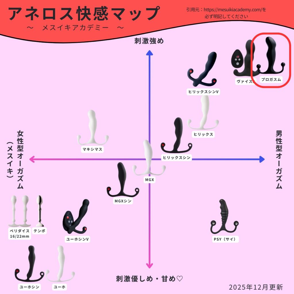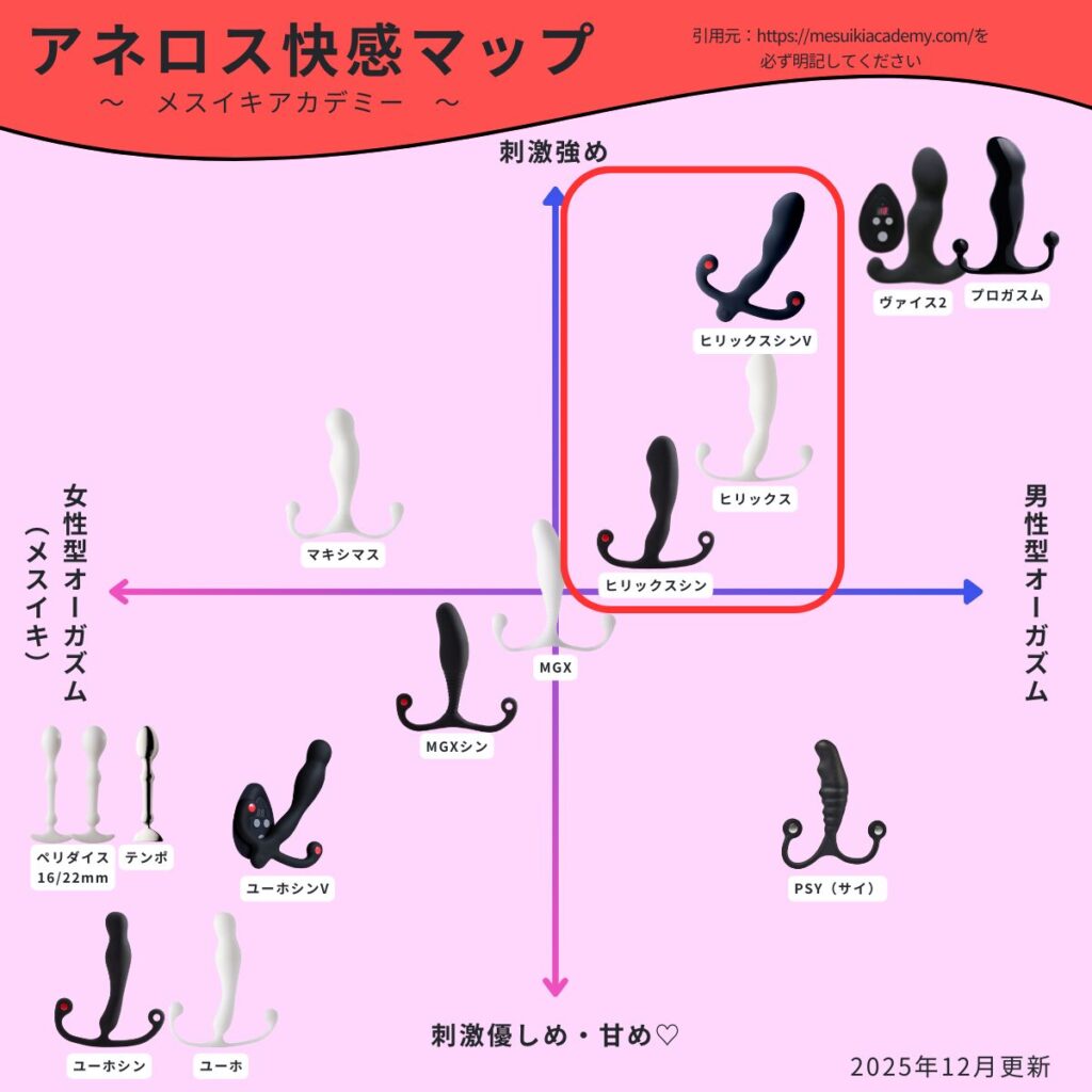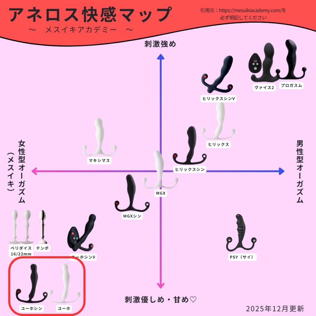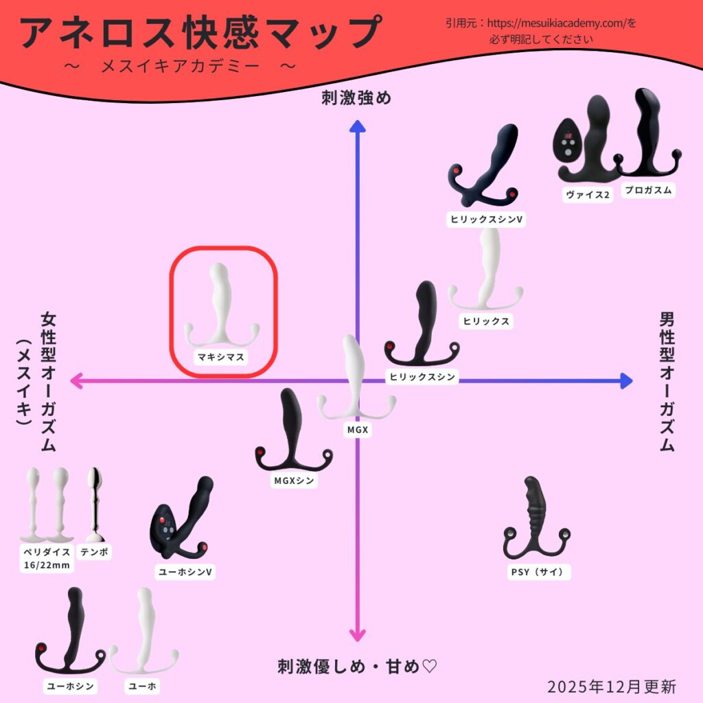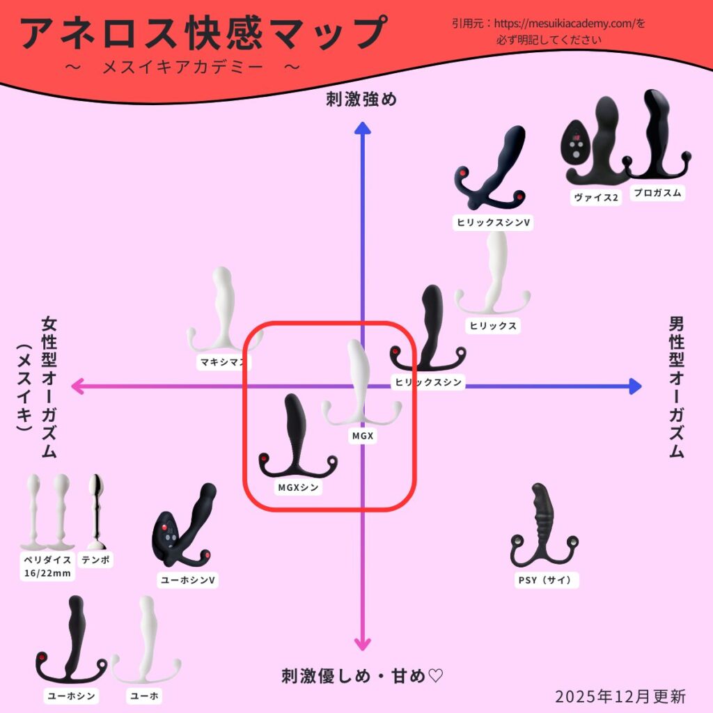 今回の快感マップは、アネロスの本質的な違いがもっとも分かりやすい二軸で整理しています。
